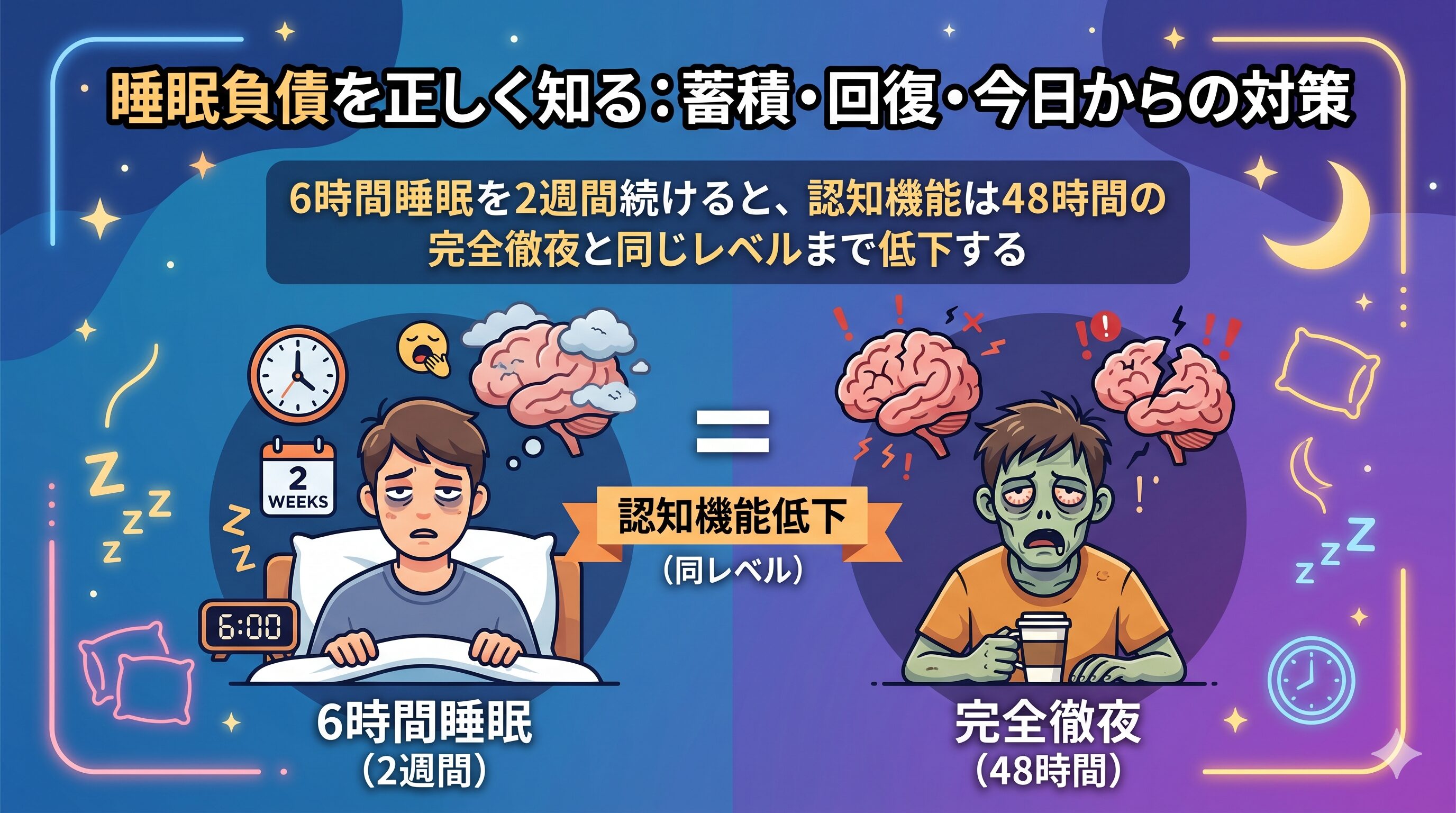 ある研究を知ったとき、衝撃を受けました。6時間睡眠を2週間続けるだけで、認知機能は48時間の完全徹夜と同じレベルまで低下する、という事実です(Van Dongen et al., Sleep, 2003)。